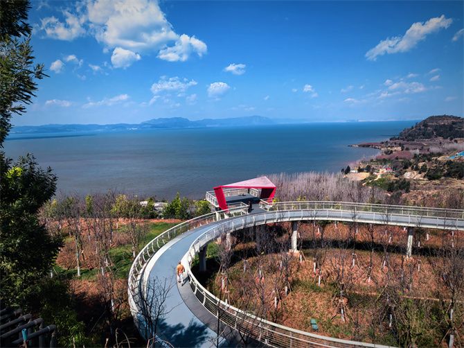 滇池绿道外海段一期工程结合沿线山、水、林、田、湖、草、村的不同风景特质,以“七彩云桥”为主题,设计建造13座特色栈桥;结合沿线的入滇河道沟渠,以“物语小桥”为主题,设计建造17座各具特色、融于环境的跨河桥。为了落实中央环保督察违建整治要求,还对铭真、长腰、大湾山的绿道周边区域约54公顷山体进行生态修复,目前,原裸露土坎陡坡均已顺坡复绿,林木数量与质量显著提升,山地植被群落健康稳定,生态环境持续向好。