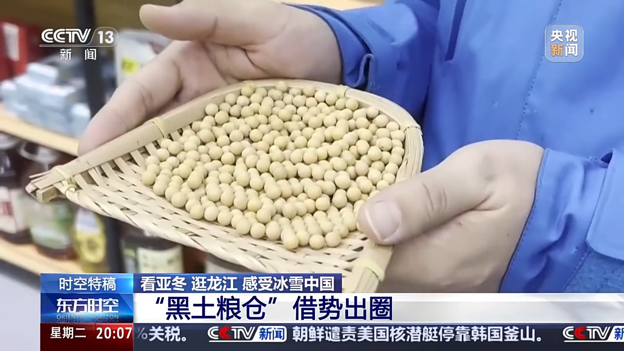 总台央视记者 郑怡哲:大家可以看到我手上拿的就是黑龙江当地产的大豆,它的种植面积和产量都是全国第一。单从种植面积上来讲,黑龙江大豆的种植面积占全国的60%左右。