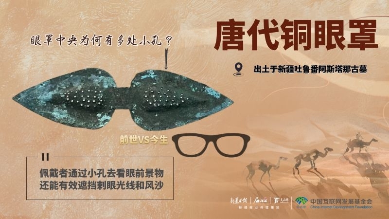 原来,当时的吐鲁番夏季光照强烈、风沙大,冬季积雪期长,雪地反射的紫外线对眼睛伤害极大。因此,铜眼罩不仅可以遮阳挡风沙,还能预防雪盲症。这种实用的护眼工具既体现了古人的智慧,也反映了当时人们对自然环境的适应能力。