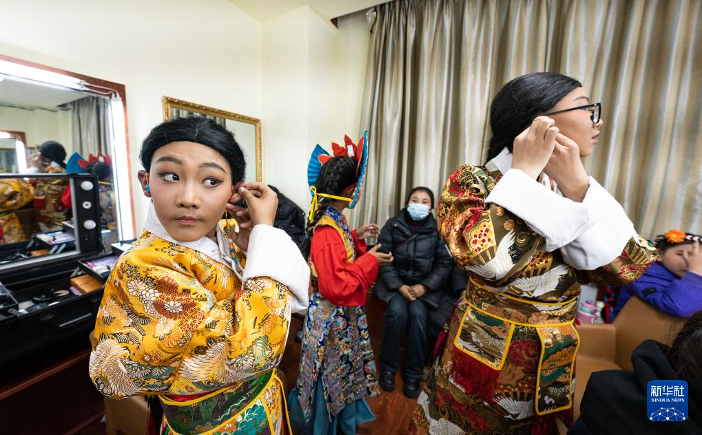 罗桑朗觉(左一)在化妆间里佩戴饰物(2月11日摄)。新华社记者 丁增尼达 摄