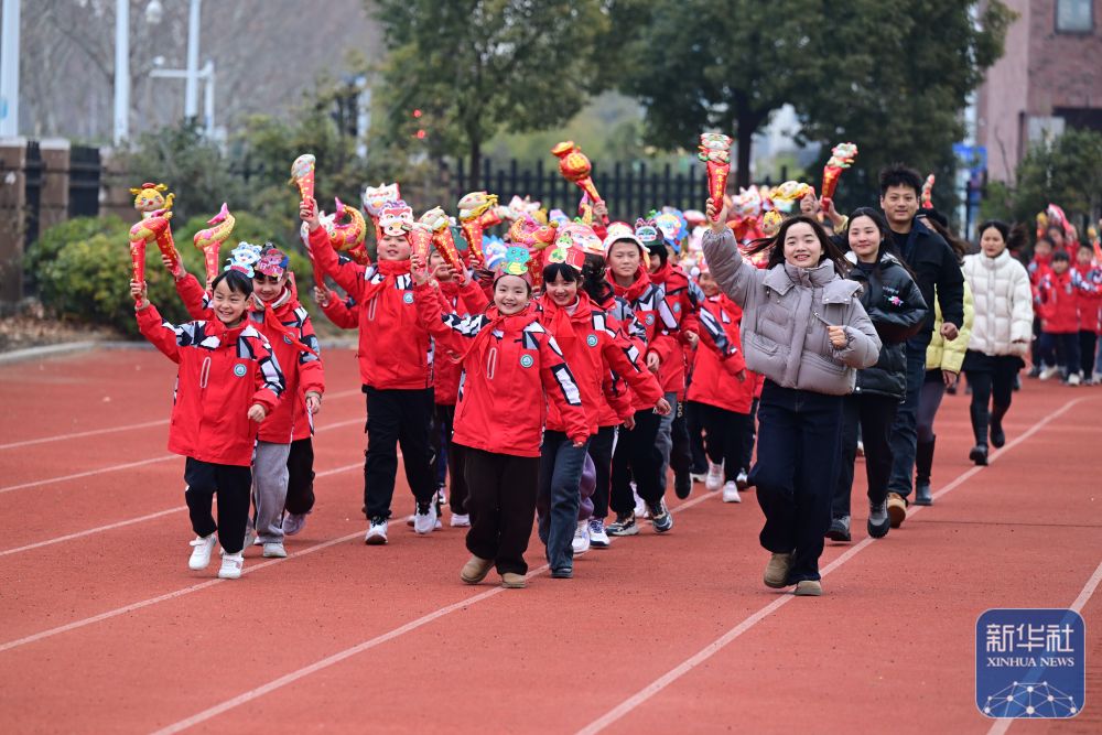 2月14日,合肥市园上园小学喻岗分校师生在开学典礼上进行“贪吃蛇”接力跑活动。新华社记者 周牧 摄