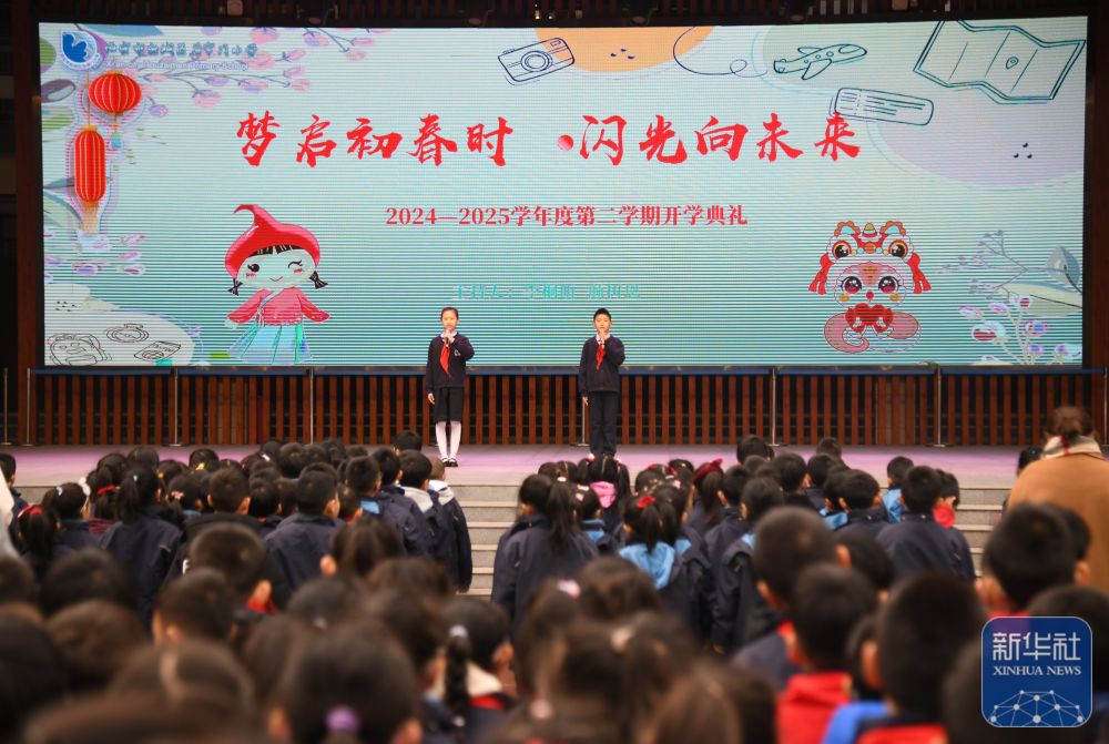 2月14日,西安市后宰门小学学生主持新学期开学典礼。新华社记者 张博文 摄