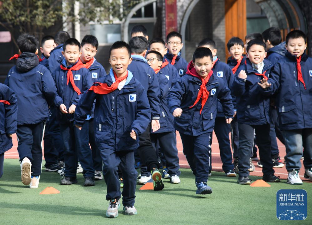 2月14日,西安市后宰门小学学生在体育课上进行热身活动。新华社记者 张博文 摄