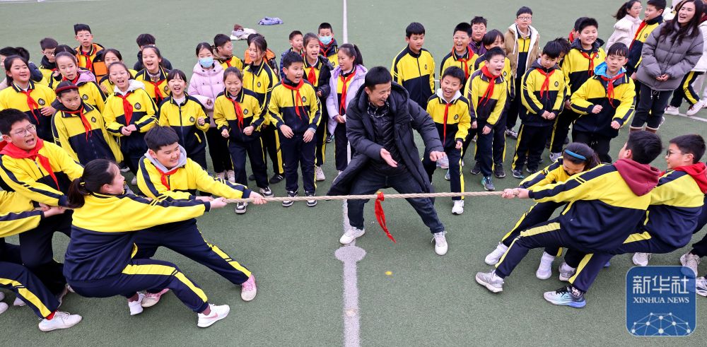2月14日,山东省枣庄市市中区东湖小学学生们在参加拔河比赛。新华社发(孙中喆摄)