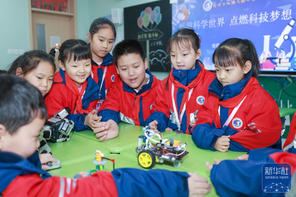 2月14日,在山东省枣庄市薛城区双语实验小学,学生们与编程机器人互动。新华社发(王龙飞摄)