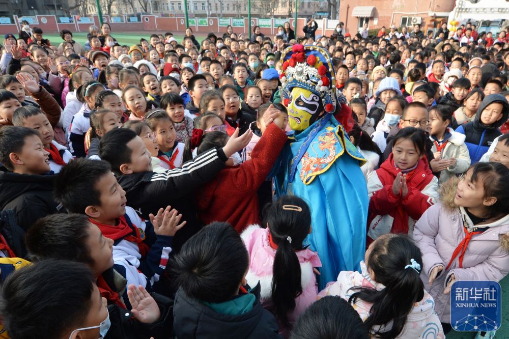 2月14日,学生们在山东青岛四方小学“传统文化润童心”主题活动中与川剧变脸演员互动。新华社发(王海滨摄)