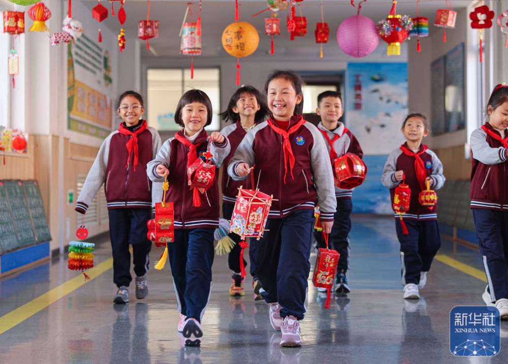 2月14日,在山东省荣成市实验小学,学生们展示自己的手工作品。新华社发(李信君摄)