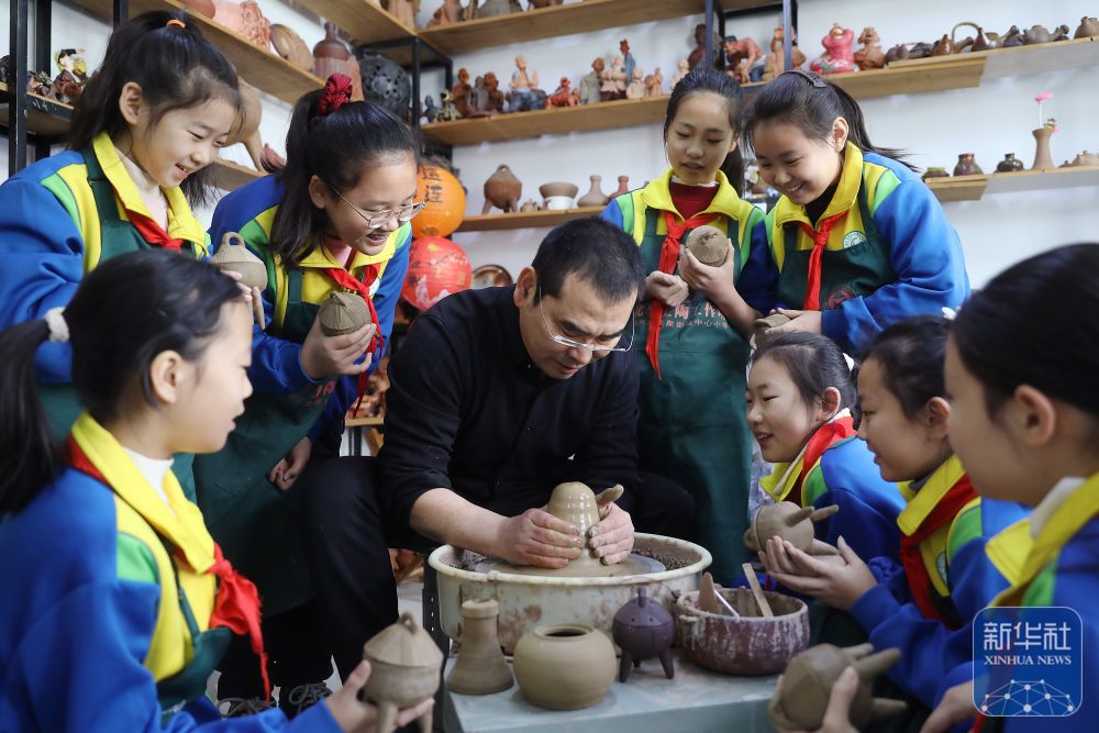 2月14日,在山东省滕州市龙泉街道中心小学,老师在教学生们制作土陶。新华社发(孙杨摄)