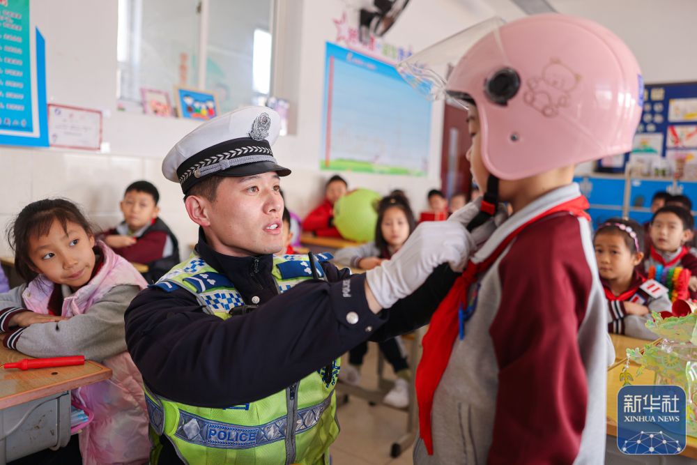 2月14日,在山东省荣成市府新小学教室内,交警为学生讲解安全头盔的正确佩戴方法。新华社发(李信君摄)