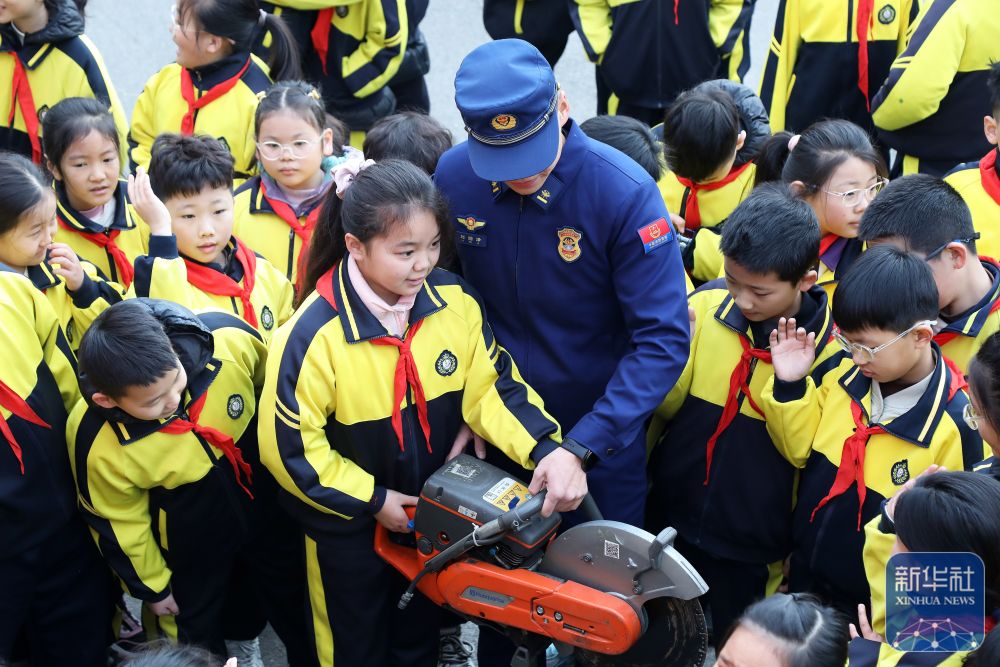 2月14日,在山东省临沂市郯城县北城实验小学,消防救援人员为小学生讲解消防装备器材。新华社发(张春雷摄)