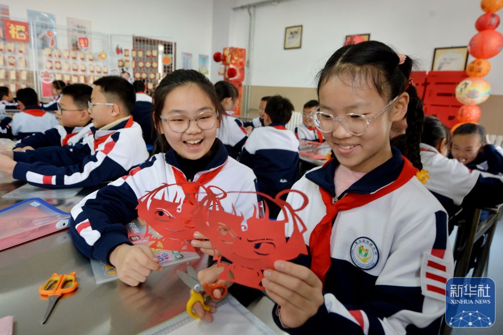 2月14日,两名学生在山东青岛宜阳路小学“传统文化润童心”主题活动中学习“哪吒”剪纸。新华社发(王海滨摄)