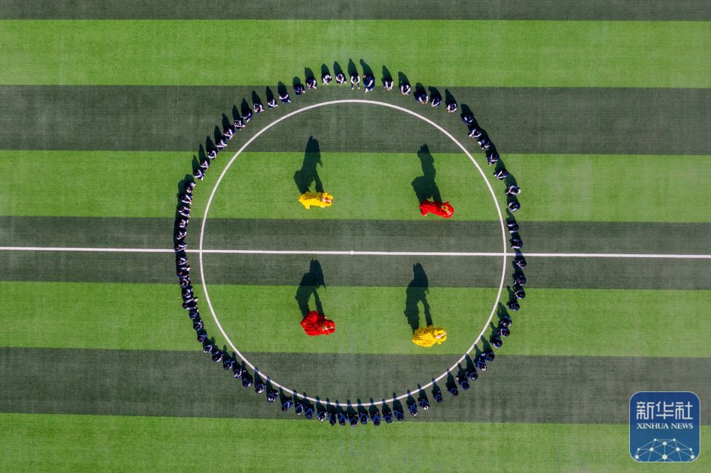 2月14日,山东省淄博科技学校龙狮社团的学生在操场上进行舞狮演练(无人机照片)。新华社发(张维堂摄)