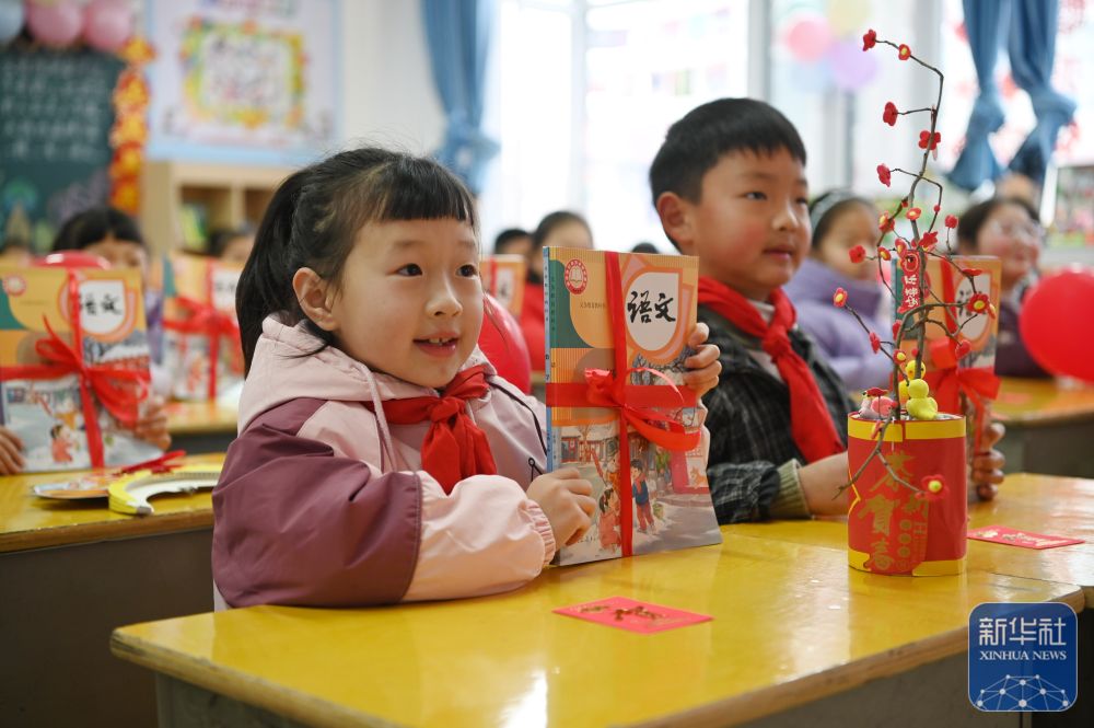 2月14日,在河南省沁阳市朱载堉学校,一年级学生展示领到的新课本。新华社发(杨帆摄)