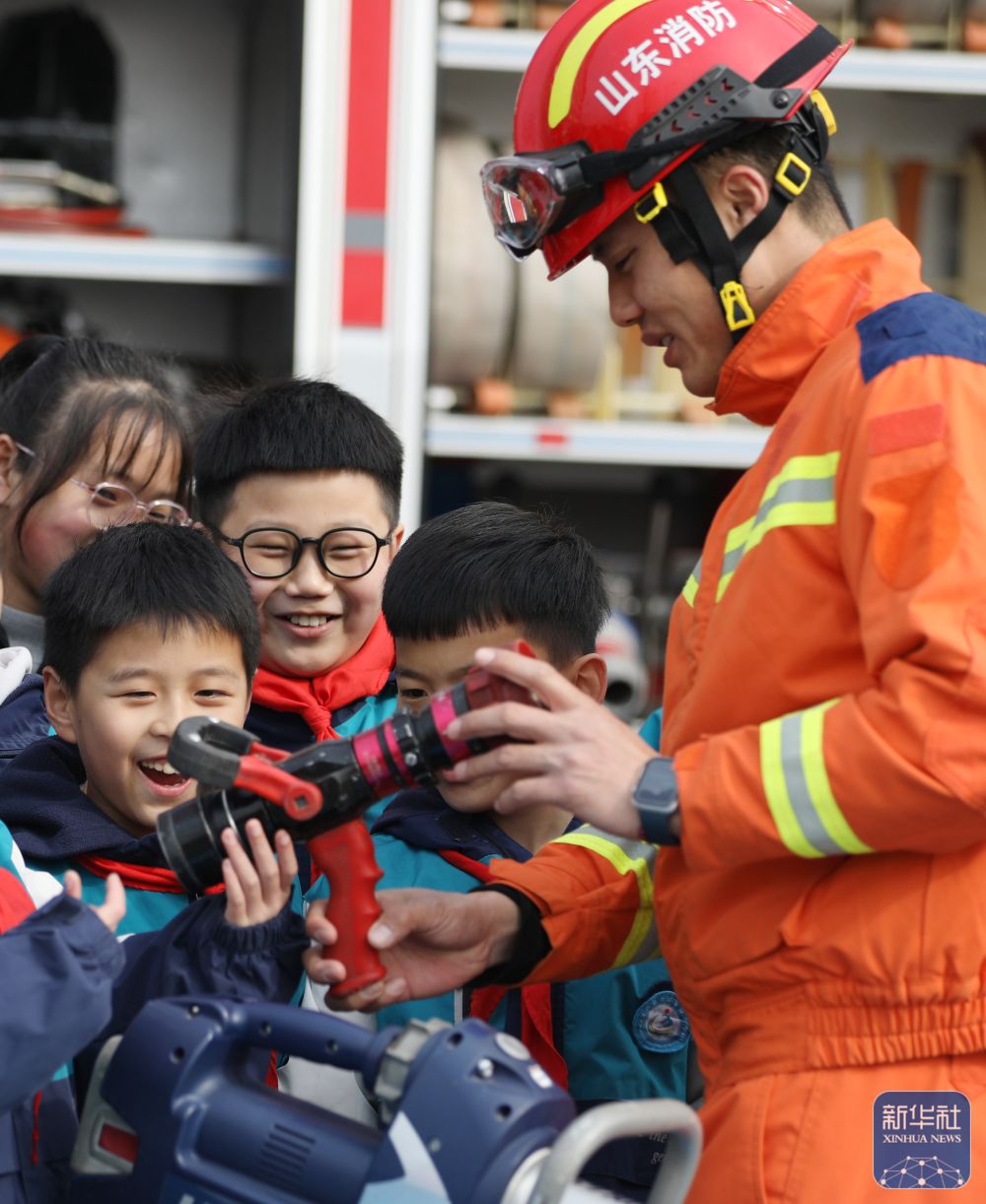 2月14日,在山东省枣庄市市中区东湖小学,消防员带领学生们近距离触摸消防器材。新华社发(王海楠摄)