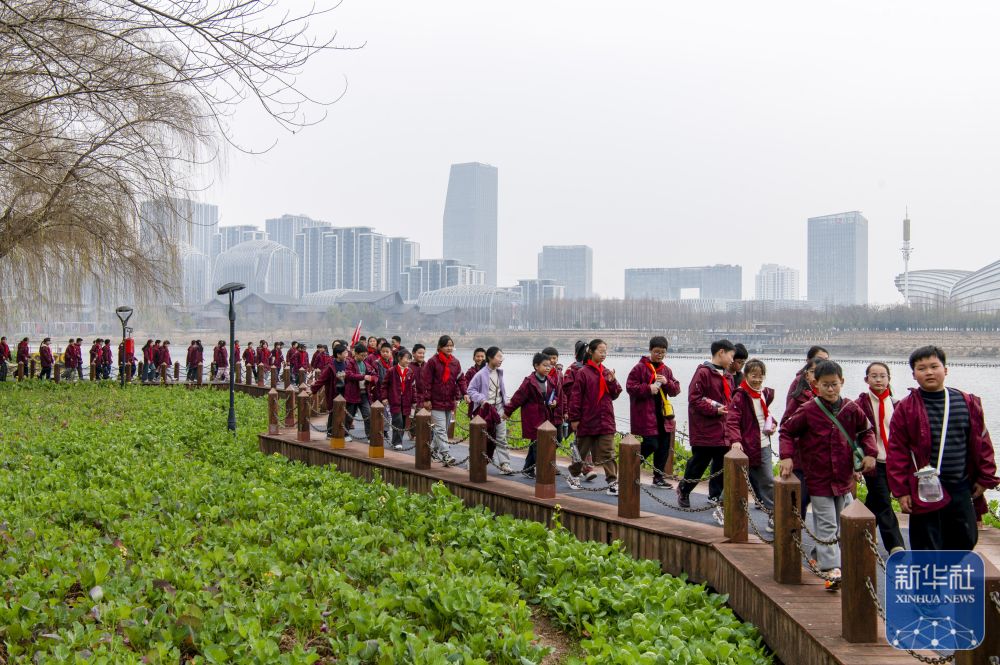 2月14日,在浙江省金华市婺城区婺州公园里,东市街小学师生集体在三江六岸绿道上快乐毅行。新华社发(胡肖飞摄)