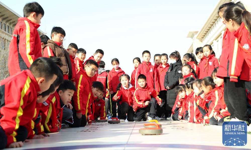 2月14日,河北省沧州市东光县第三实验小学的学生们在课间参加陆地冰壶活动。新华社发(周洋摄)