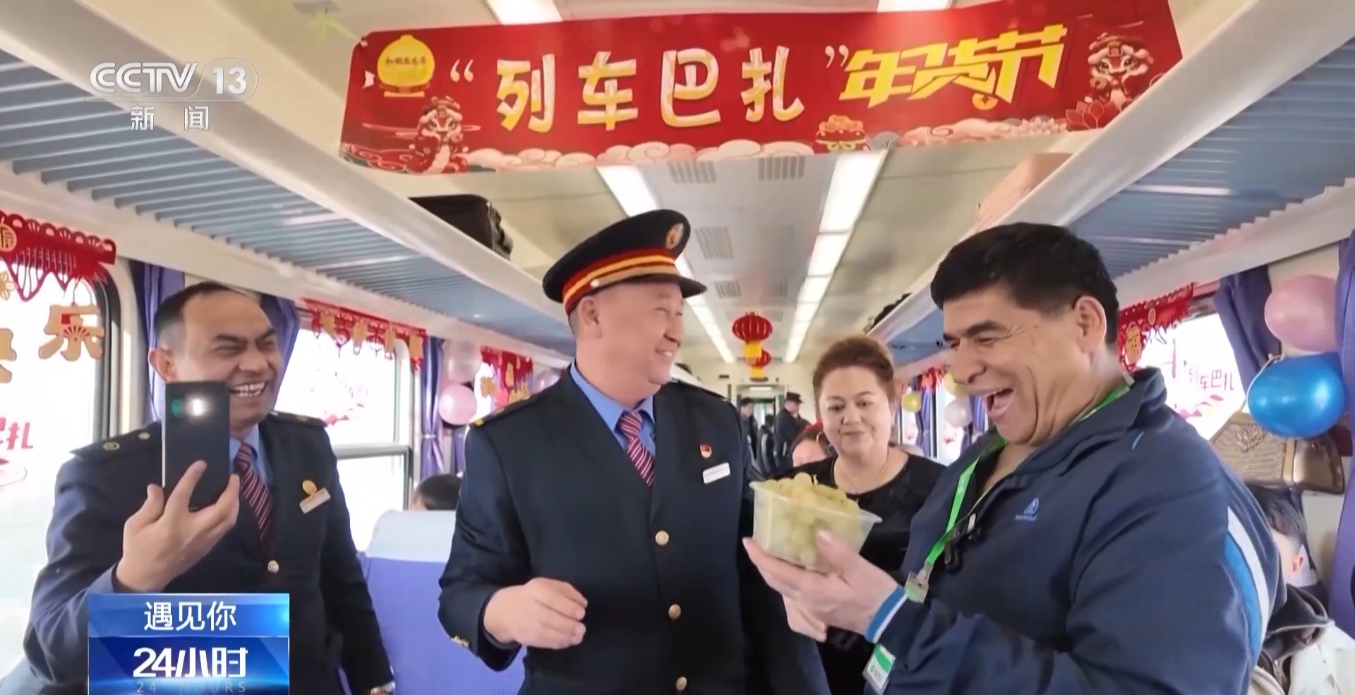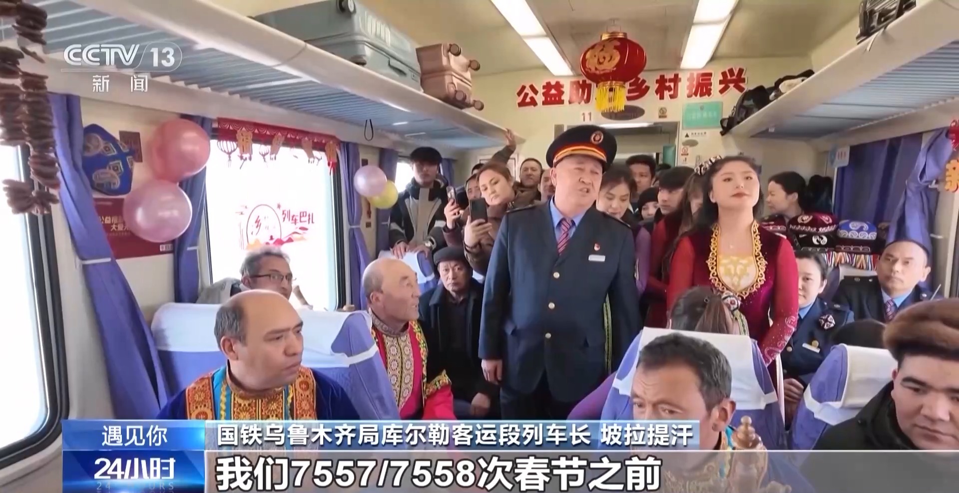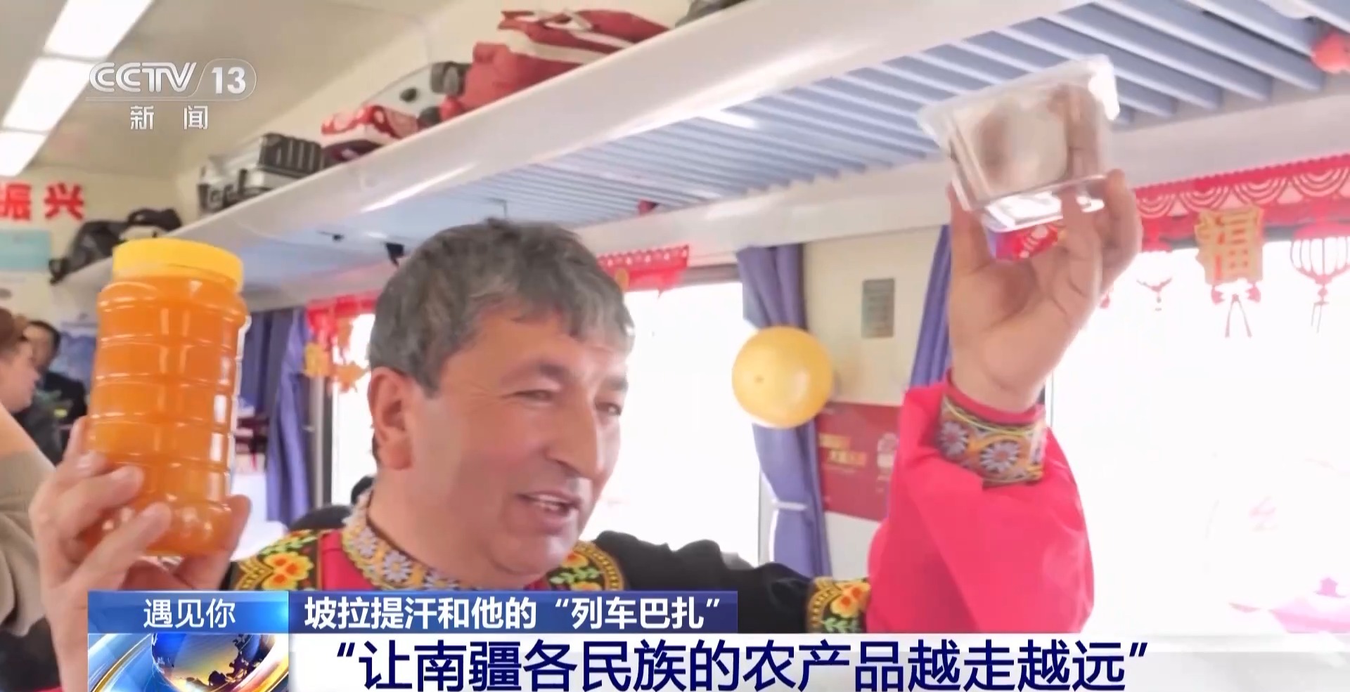 国铁乌鲁木齐局库尔勒客运段列车长 坡拉提汗:欢迎大家坐我们和田开往乌鲁木齐的7557/7558次“和田玉龙号”列车!我们7557/7558次春节之前,每十天搞一次“列车巴扎”年货节,我们今天年货节的主题是,公益助力,乡村振兴。我们最大的目的是,通过我们“和田玉龙号”公益小慢车,让南疆各民族的农产品越走越远!喜欢农产品的同志们到11号、12号车厢选购自己喜欢的产品。
