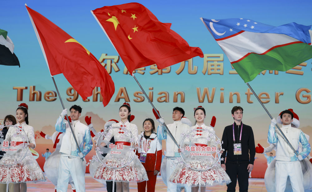 2月14日,中国体育代表团旗手徐梦桃(中)在亚冬会闭幕式上。新华社记者 张涛 摄