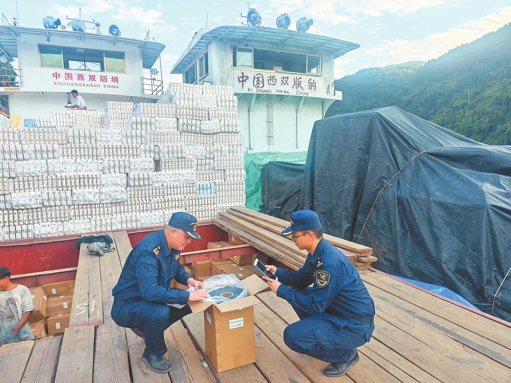 海关关员在关累港口岸对出境货船开展检查。 本报通讯员 刘俊辰 摄