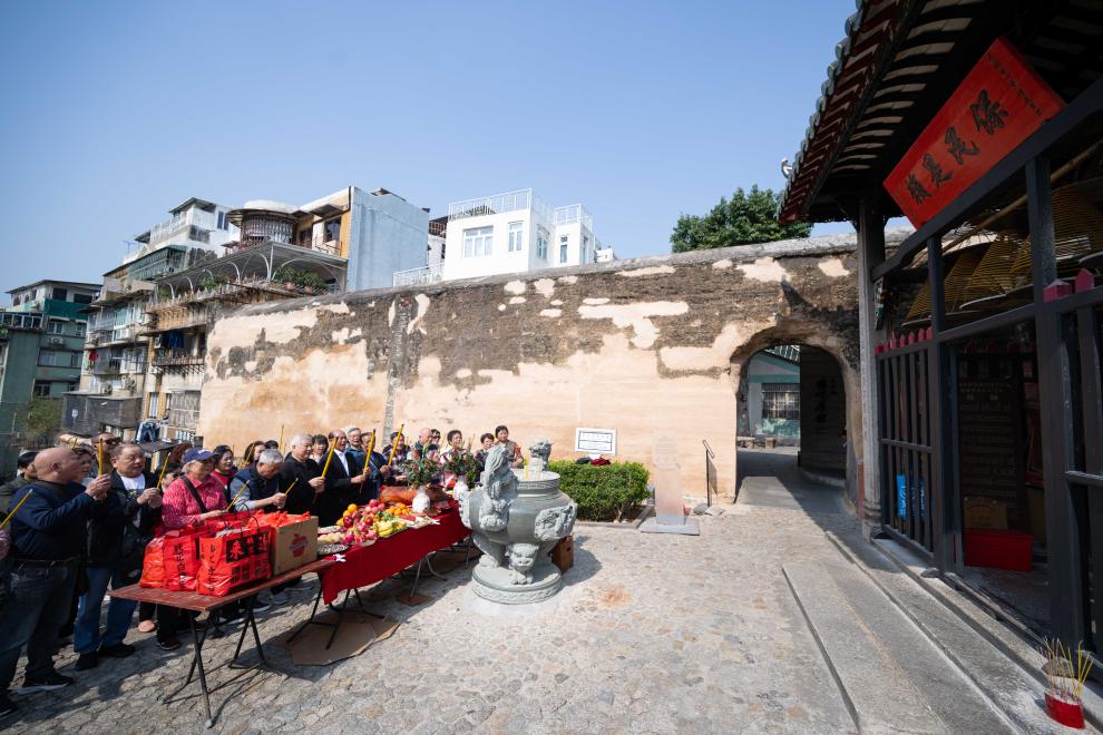 2月16日,澳门哪吒信俗国家级非遗项目代表性传承人叶达带领成员和街坊在大三巴哪吒庙前举行新春祈福。新华社发(张金加 摄)