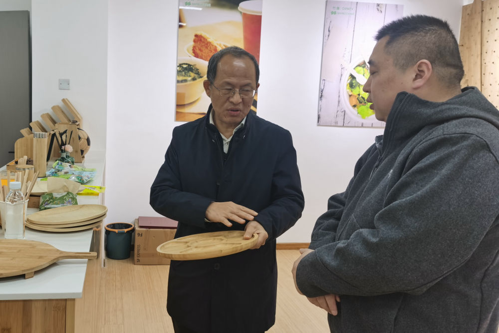 兰定国(左)在进行“以竹代塑”调研。(受访者供图)