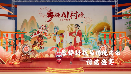 技术破壁,虚实交融激活文化生命力。《乡脉·AI村晚》以AI未来影像系统为技术底座,通过实拍与AI合成的无缝衔接,让《皮影田趣》《草原迎春》等节目突破时空桎梏。XR技术与3D实时渲染技术立体复现了陕西皮影的灵动剪影、西藏锅庄的旋舞韵律,使观众仿佛置身于广袤乡土。而AI数字人“通通”与主持人杜雨轩的双线叙事,更以“数字导游”身份带领观众跨越千山万水,在虚实交织中体味乡村文化的肌理。