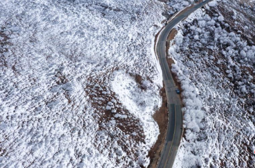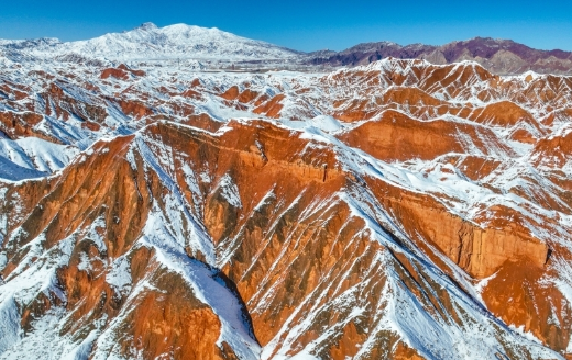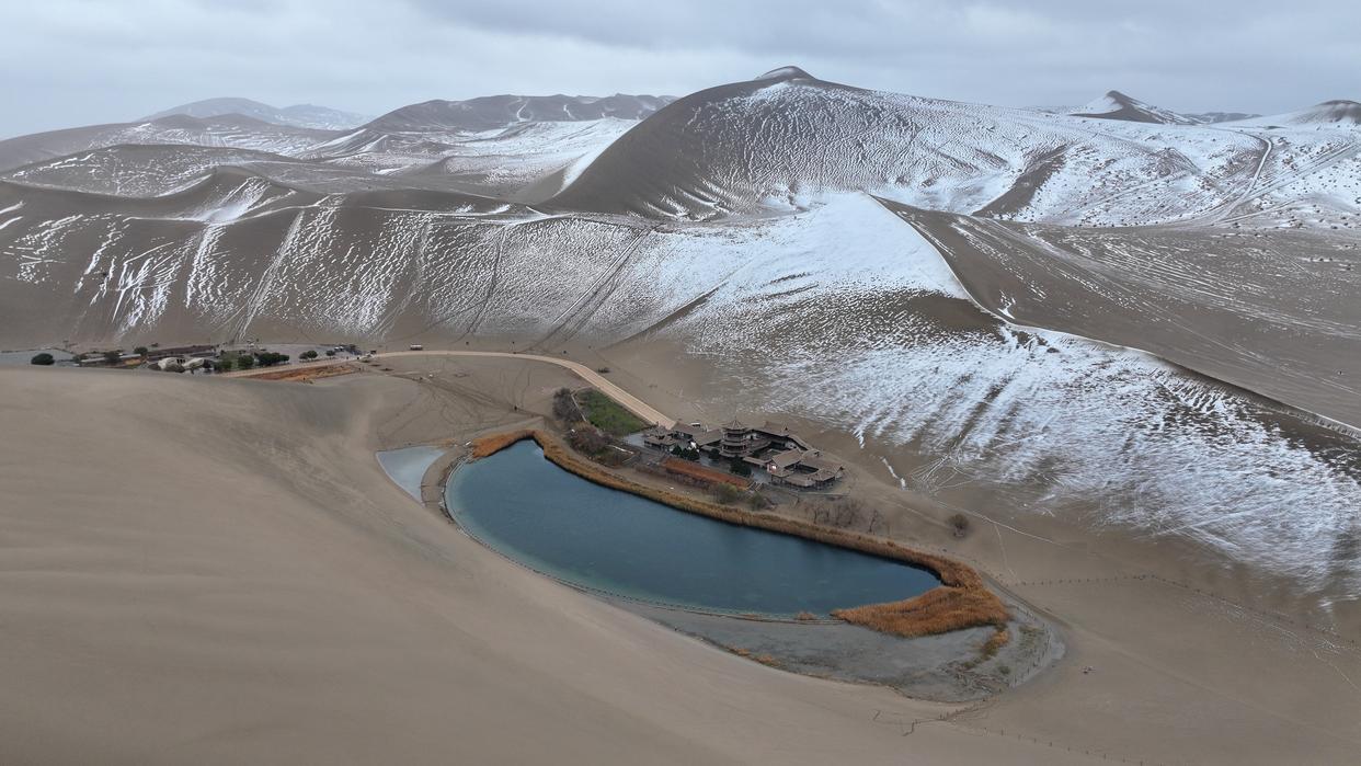 这是2014年11月23日拍摄的敦煌市鸣沙山月牙泉景区雪景(无人机照片)。新华社发(张晓亮摄)