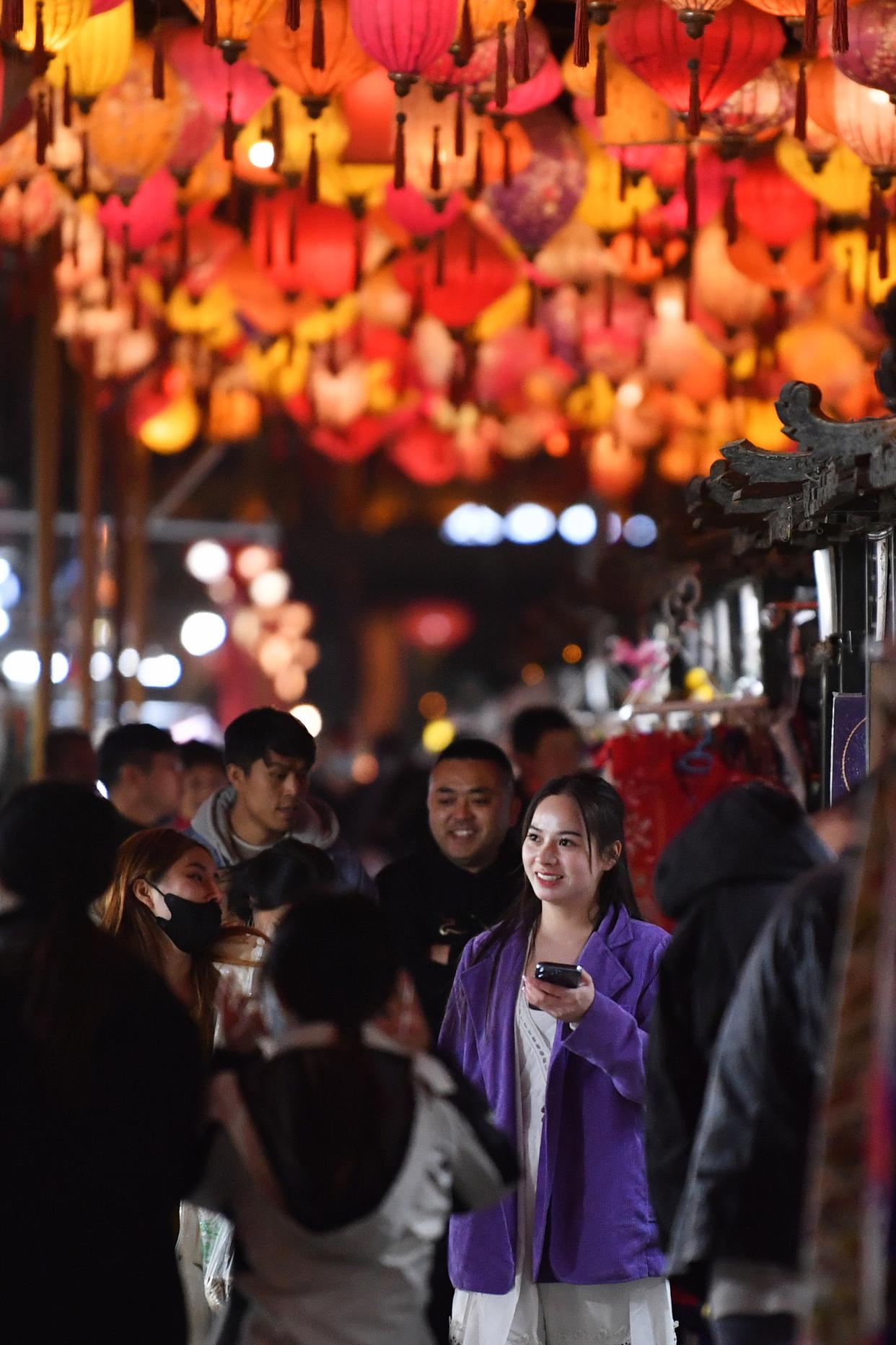 2023年3月16日,游客在敦煌夜市游览。新华社记者 陈斌 摄