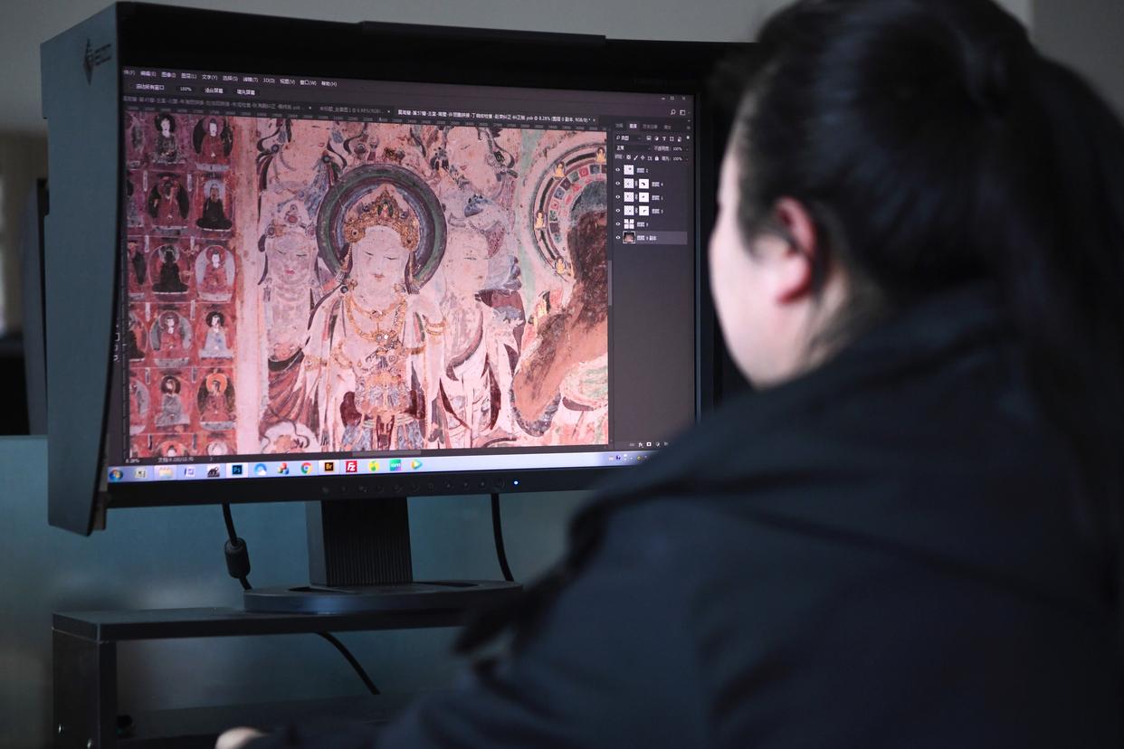 2023年4月25日,敦煌研究院文物数字化保护团队图像处理人员年海丽在拼接壁画图像。新华社记者 陈斌 摄