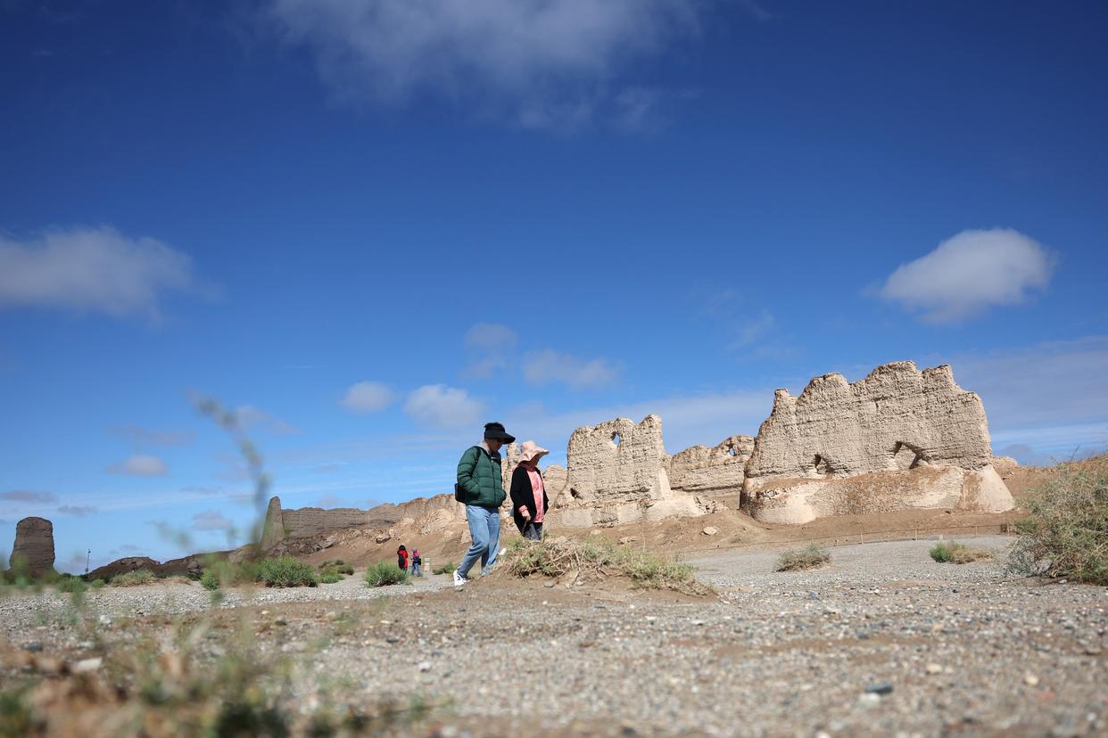 2024年9月4日,游客在雨后的玉门关遗址区大方盘城游览。新华社记者 陈斌 摄