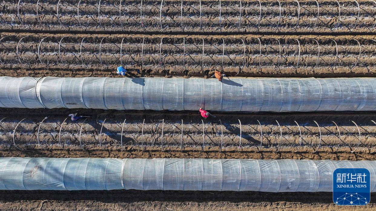 2月17日,农民在河北省遵化市一家蔬菜种植基地搭建暖棚,准备播种春季马铃薯(无人机照片)。 新华社发(刘满仓摄)