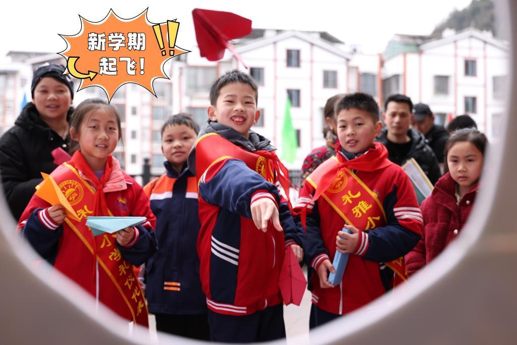 2月16日,在湖南省怀化市通道侗族自治县礼雅小学,学生们参加投掷纸飞机赢好运趣味游戏。新华社发(粟勇主 摄)