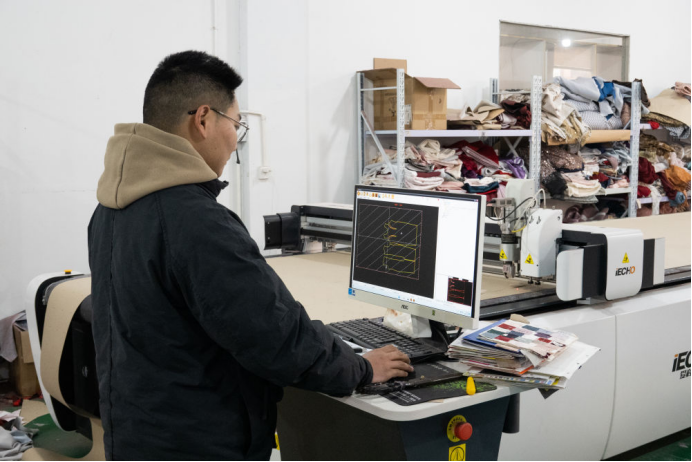 六安市忠缘婚纱礼服有限公司工厂负责人许小龙在操作电脑自动裁床。新华社记者 赵金正 摄