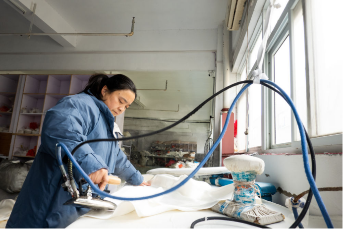 今年70岁的许昌应是第一批从苏州回流的丁集人之一。镇里较低的土地和人工成本让他看到了机遇。他将一个废弃的砖厂改造成工厂,招聘了100多人生产婚纱。