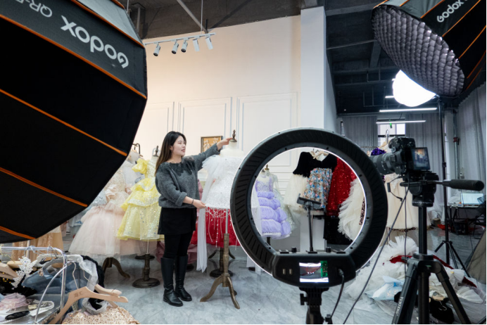 在丁集镇,主播正在抖音平台上直播销售儿童礼服。新华社记者 赵金正 摄