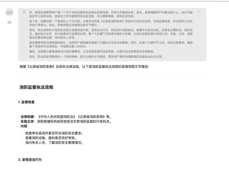 在火灾防控方面,昆明消防通过AI大模型为消防监督人员提供了强大的信息支撑。在日常检查中,AI模型能够根据法律法规和技术规范,自动生成检查流程和要点,确保监督执法工作的规范性和科学性。通过数字赋能构建消防行政执法监督智能评查应用场景,对行政执法案件实行智能化评查分类,搭建易错案件特征数据库,实时总结办案规律,为监督员在执法过程中提供常见错误提醒、自由裁量建议等智能化辅助服务。例如,在检查商场、影院等人员密集场所时,AI模型可以实时提示重点检查区域,如消防通道是否畅通、灭火器材是否完好等,提供对应技术规范相关规定和技术参数,并自动生成整改建议。此外,AI还能通过大数据分析,预测火灾风险高发区域,提前部署防控措施,真正实现了从“事后处置”到“事前预防”的转变。