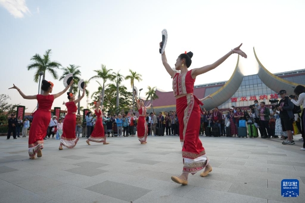 新华社昆明2月18日电(记者吉哲鹏、王贤思)18日18时许,泰国游客萨提拖着行李箱,和其他14名来自泰国、老挝的游客走出中老铁路西双版纳站,迎接他们的是表示祝福的洒水仪式和欢快的傣族舞蹈。