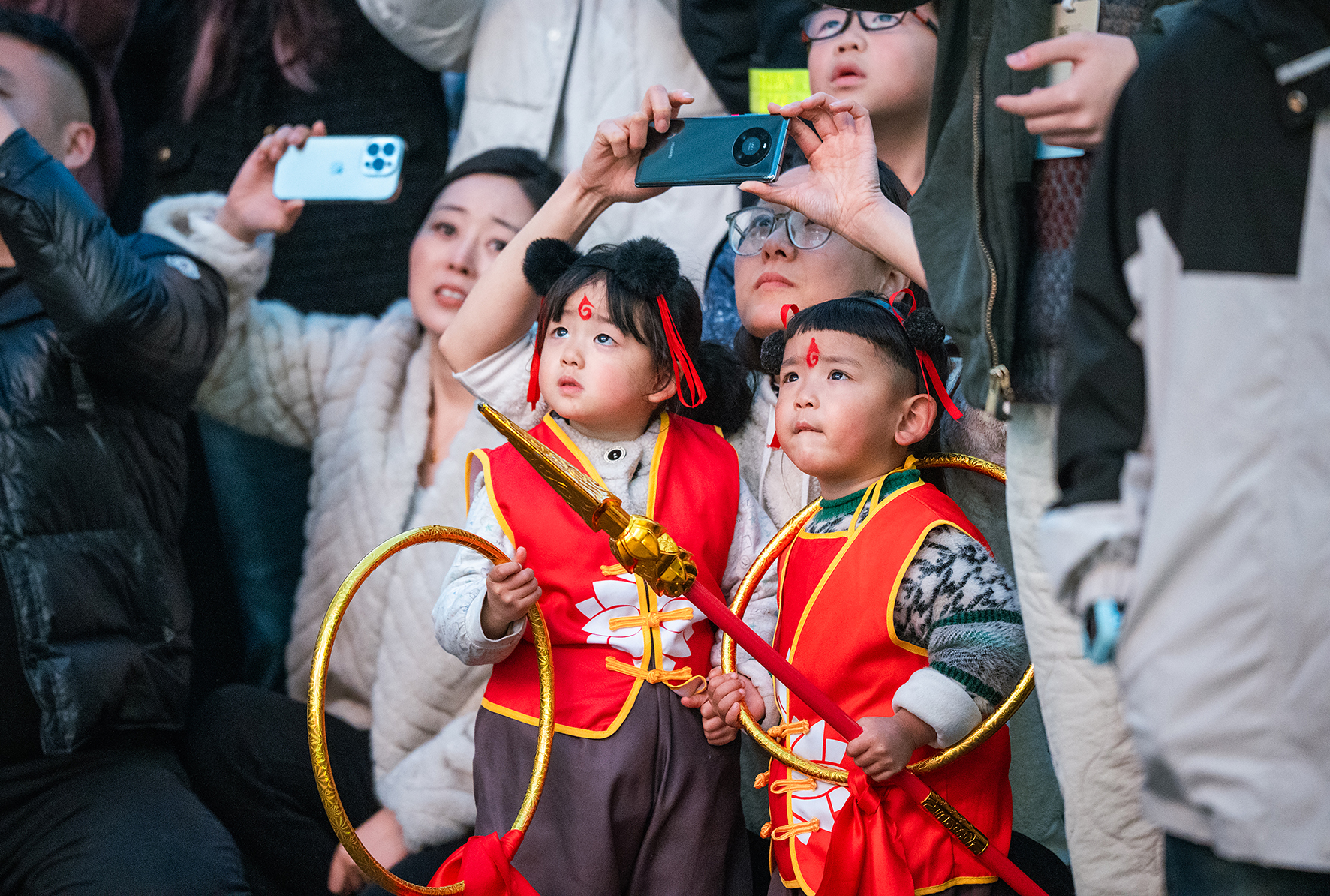 冰海与火焰逐渐叠化,裂空爪瞬时挥舞而出,似将4D悬浮屏幕自中间向上下缓缓拉开,其间的空中走廊现出3位唢呐演奏家的身影,高亢的唢呐声与电影《哪吒之魔童闹海》的片段随即亮起。2月16日晚,浙江省杭州市上城区西湖湖滨商圈,聚拢而来的观众为眼前一幕所吸引。