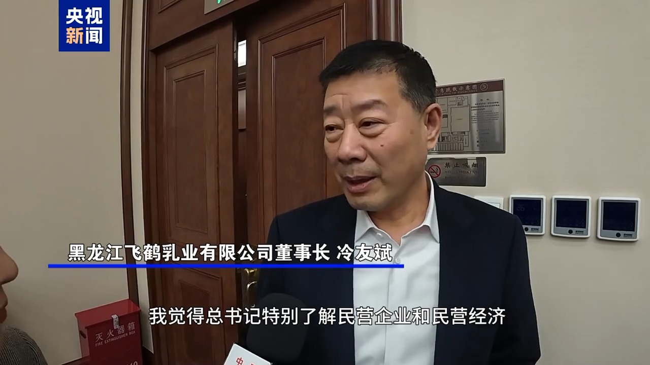 黑龙江飞鹤乳业有限公司董事长 冷友斌:总书记特别了解民营企业和民营经济,也特别了解发展中的问题,总书记鼓励我们创新,敢担当敢作为,另外也要有社会责任。近10年中国的婴儿配方奶粉在中国的市场占有率已经完全超过外资品牌。国际化的道路虽然很长,但是我们对输出中国品质、中国品牌非常有信心。