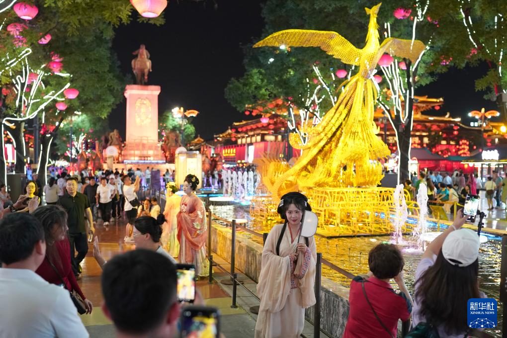 游客在西安大唐不夜城景区游览(2024年5月20日摄)。新华社记者 邵瑞 摄