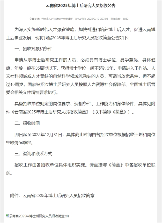 昆明信息港讯 记者江枫 近日,云南省人力资源和社会保障厅发布了云南省2025年博士后研究人员招收公告,计划招收700余名博士后,涉及高原特色现代农业、先进制造业、绿色能源、新材料、生物医药、数字经济、烟草、电力等行业领域。