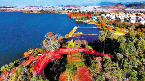 滇池绿道外海段环线长、环境复杂,昆明市在建设之初就提出要全面保护现有自然山体、滇池、湿地、农田乡道等生态本底,在不破坏原有生态前提下,配套种植湿地绿化和水生植物,打造野趣盎然的绿色生态绿道,构建起“山水林田路湖”的生态格局。