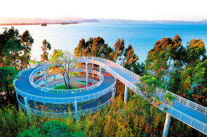 在滇池南岸沙滩主题公园到大湾山之间,一条“之”字形的螺旋栈桥在山间徐徐展开,桥长800.85米,高差56米。这就是滇池绿道最美景观之一湖之桥。