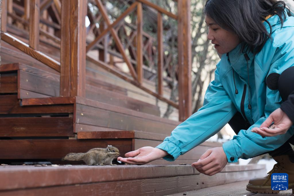 2月23日,游客在普达措景区投喂松鼠。