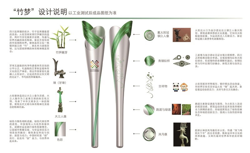 “竹梦”高72厘米,在造型设计上以三星堆青铜大立人像为灵感,融合竹节造型,既彰显中华文明源远流长,又寓意体育精神生生不息。顶部两叶竹芽优雅舒展,宛若热情的双臂,向世界传递着开放包容的中国气度和成都这座城市的友好情怀。