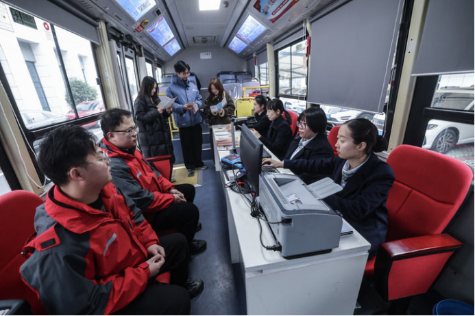 浙江省嘉兴市南湖区政务服务中心政务服务大篷车来到浙江凯乐士科技集团股份有限公司,企业员工在车上咨询社保、医保、人才等方面政策(2025年2月25日摄)。新华社记者 徐昱 摄