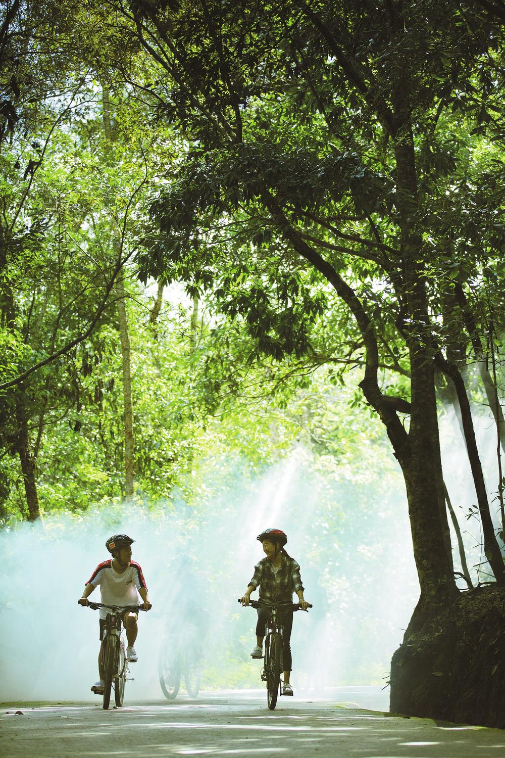 游客在太阳河森林公园骑行。记者 朱海 摄