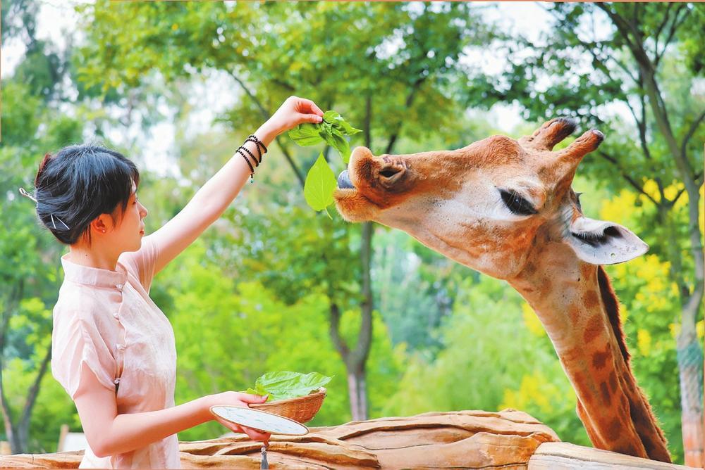 云南野生动物园内,游客与长颈鹿互动。记者 朱海 摄