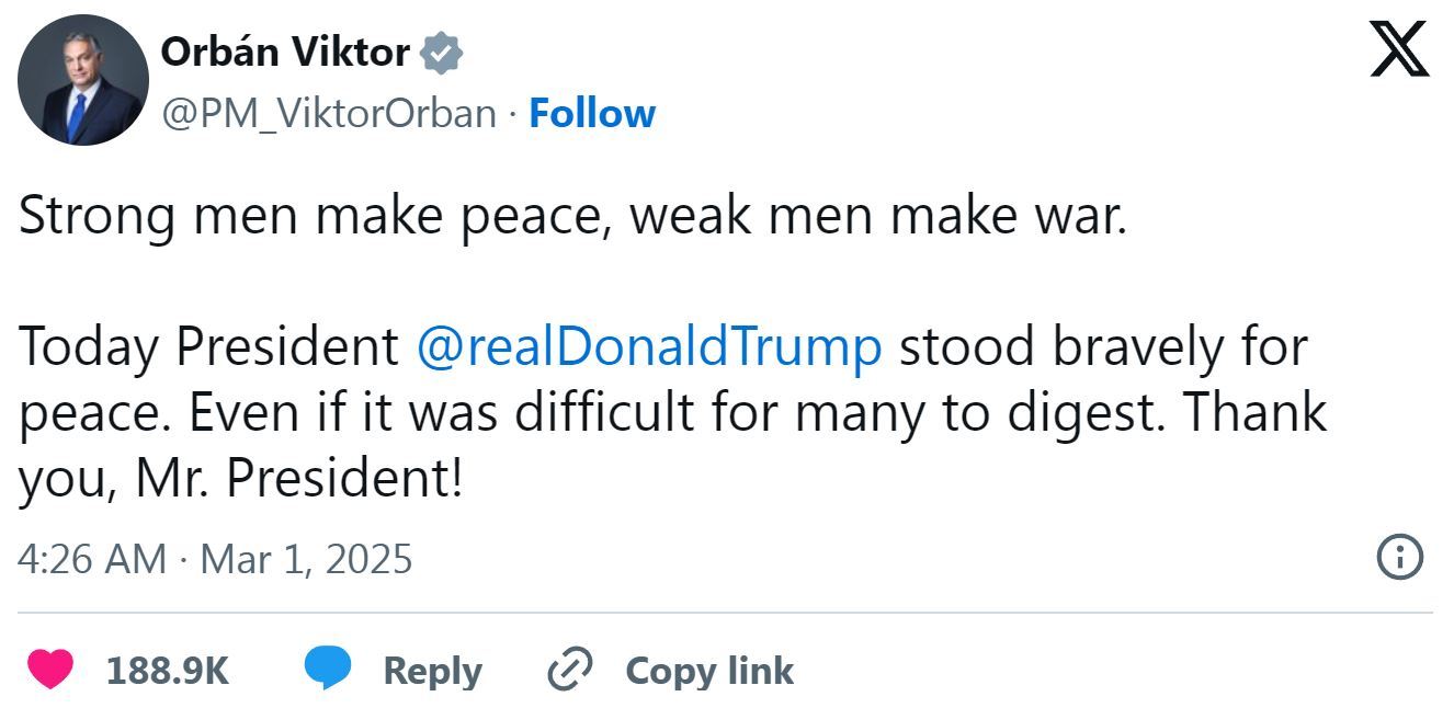 匈牙利外长西雅尔多也认为,特朗普与泽连斯基的会面表明了“谁支持和平,谁想要战争”。他还强调,只有美俄达成协议才能恢复和平。