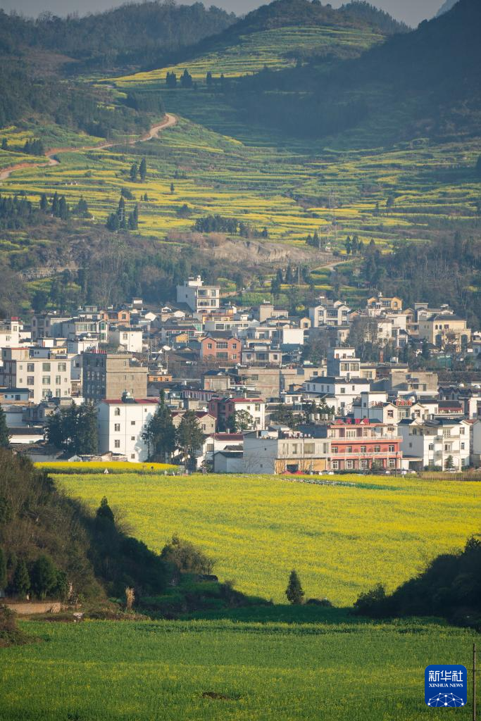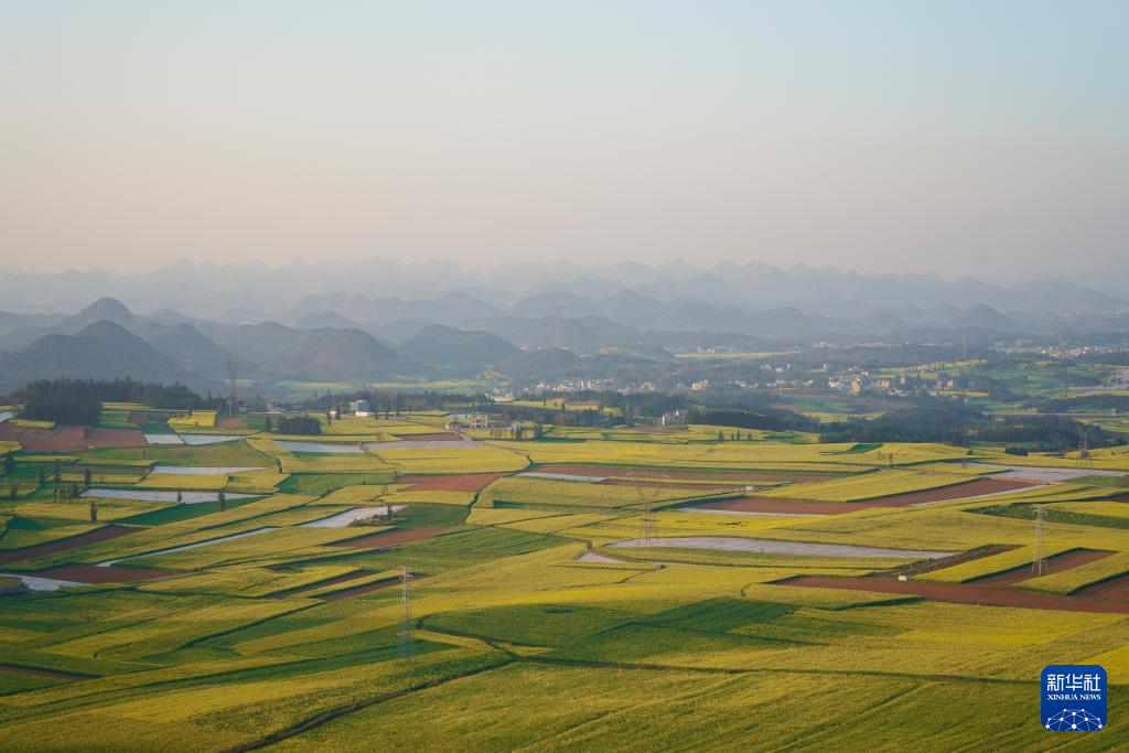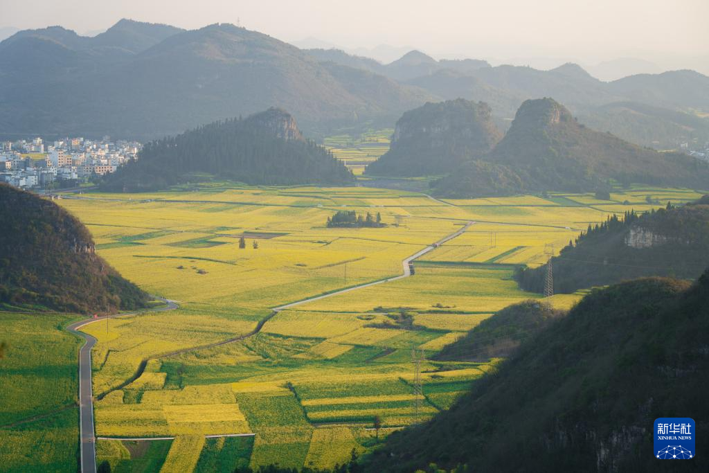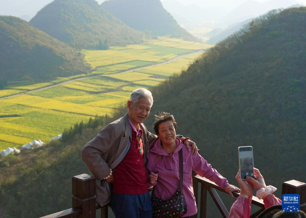 近日,云南省曲靖市罗平县百万亩油菜花竞相绽放,金黄色的油菜花田与山峦、村庄相互映衬,构成了如诗如画的田园风光,吸引各地游客前来观花赏景。(新华社 记者高咏薇)